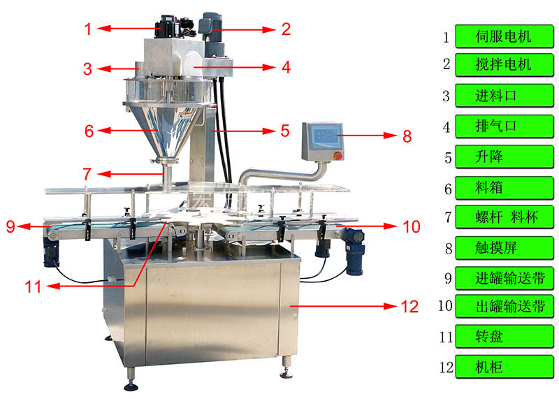 該系列罐裝機能完成喂罐、托罐、充填計量、稱重選別等工作,可與其它設備配套組成整套罐裝流水線,適用于充填眼影粉、閃粉、胡椒粉、辣椒粉、奶粉、米粉、蛋白粉、豆奶粉、雞粉、咖啡粉、藥粉、添加劑、香精香料等。