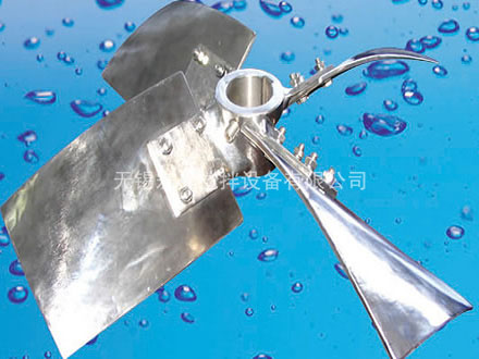 旋槳式攪拌器由2~3片推進式螺旋槳葉構成,工作轉速高,葉片外緣的圓周速度一般為5~15m/s。旋槳式攪拌器主要造成軸向液流,產生大的循環(huán)量,適用于攪拌低粘度 (<2Pa·s)液體、乳濁液及固體微粒含量低于10%的懸浮液。攪拌器的轉軸也可水平或斜向插入槽內,此時液流的循環(huán)回路不對稱,可增加湍動,防止液面凹陷。
